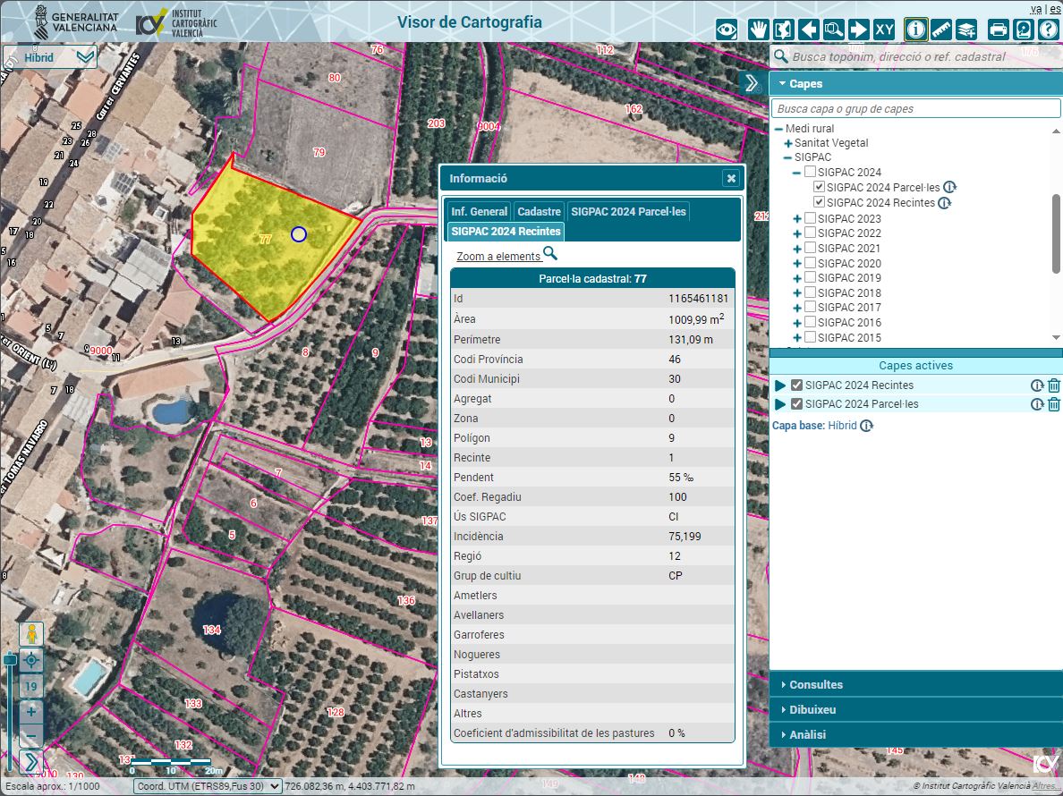 Se ha añadido al Visor de Cartografía y al Catálogo de la IDEV la información correspondiente a la capa gráfica de las parcelas y recintos con usos agrarios definidos que acompañan a la información del Sistema de Información Geográfica (SIGPAC) en la Comunitat Valenciana válidos para la campaña 2024 (datos fecha 15-01-2024).